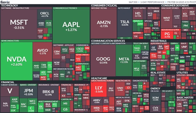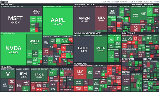 Tři hlavní akciové indexy zakončily týden v zelených číslech. Nálada na trhu se zlepšila poté, co investoři získali větší jistotu ohledně plánů prezidenta Donalda Trumpa na zavedení cel. Nová inflační data nakonec vyzněla příznivěji, než se očekávalo. Obchodníci také přešli bez většího znepokojení páteční zveřejnění údajů o maloobchodních tržbách, které v lednu klesly o 0,9 %, což bylo horší než očekávání analytiků.