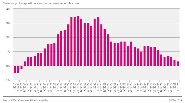 Index spotřebitelských cen meziročně vzrostl o 0,3 % (odhad: +0,2 % po lednových +0,4 %), meziměsíčně ceny vzrostly o 0,6 % (odhad: +0,5 % po lednových -0,1 %). Jádrová meziroční inflace dosáhla stejně jako v lednu 0,9 % (odhad: +0,7 %).