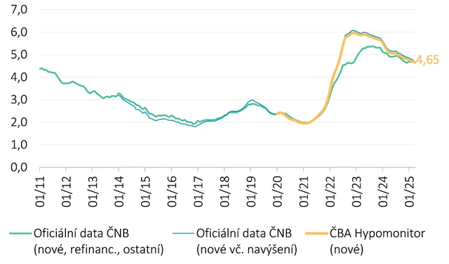 Počet nových hypoték v dubnu dosáhl 6 389, což je o 21 % více než před rokem. ČBA odhaduje, že po sezónním očištění se jejich počet pohybuje okolo 6 064, přibližně 1 % pod průměrným počtem (6 103) v předchozích třech měsících. Dynamika počtu nových hypoték v posledních dvou měsících naznačuje jejich letošní nárůst na celkový počet okolo 73 tisíc, což by bylo téměř o pětinu více než v loňském roce.