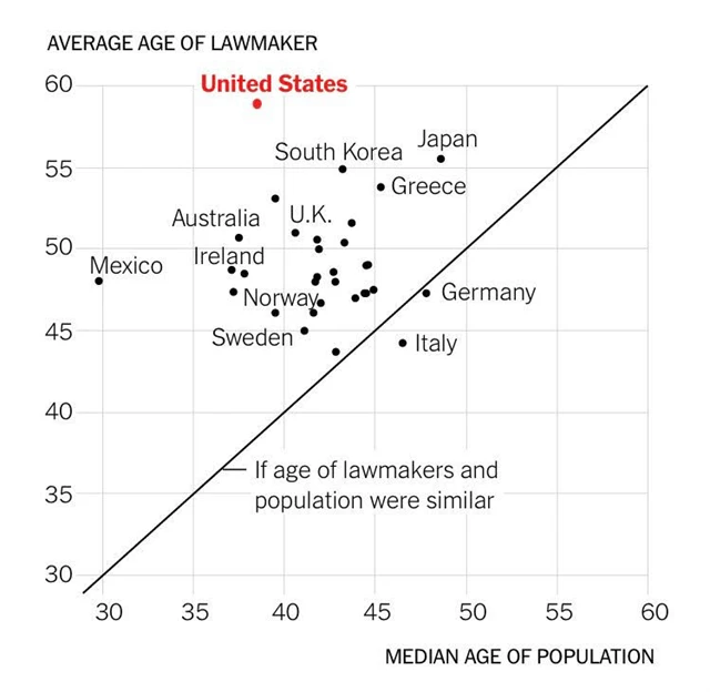 Americký Kongres je ve srovnání s parlamenty dalších vyspělých demokratických zemí hodně starý. A když zákony schvalují "starší lidé", je v tom jistě spousta moudrosti, ale možná i konzervatismu a třeba i zpátečnictví. Kdo ví.