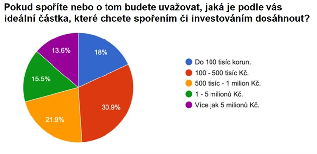 Aktuální průzkum Ipsos ukazuje, že 31 % mladých chce naspořit mezi 100 a 500 tisíci korun, 18 % stačí našetřit dokonce jen do 100 tisíc. Další téměř čtvrtina (22 %) cílí na částku mezi půl milionem a milionem korun. Přes milion chce mít jen necelých 30 % mladých, spoření velkých částek je pro ně zatím nepředstavitelné, těžko realizovatelné a vlastně i zbytečné.