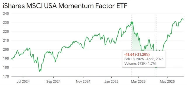 Momentové tituly na americkém trhu lze snadno sledovat a investovat do nich pomocí ETF s tickerem MTUM. Ten již v polovině května napravil veškeré jarní poklesy a je na historickém maximu. Zatímco index S&P 500 klesl od února do dubna podle závěrečných kurzů o necelých 19 %, MTUM spadl do medvědího trendu. Je ale na novém vrcholu.