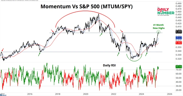 To, že současnou rally na americké burze táhnou právě momentové tituly, je zřejmě z relativní nadvýkonnosti MTUM vůči indexu S&P 500 (na grafu je ETF s tickerem SPY, nejčastěji používaný reprezentant indexu největších amerických firem v rámci trhu s ETF). Poměr MTUM a SPY tento týden stoupl na nejvyšší hodnotu za 41 měsíců, výše byl naposledy v prosinci 2021. Mimochodem, tehdy vrcholil býčí trend a schylovalo se ke slabému roku 2022.