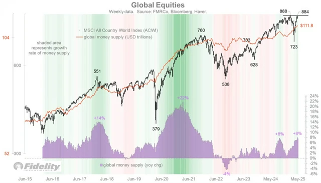 Akciový trh má obecně rád dostatek likvidity. Globální peněžní zásoba přitom dosahuje nových maxim a v současnosti roste o zhruba 8 % za rok. To posunulo index světových akcií MSCI ACWI zpět na úroveň únorového historického rekordu. Jen na základě níže uvedeného grafu se tak zdá, že globální akciový trh bude pokračovat v růstu.