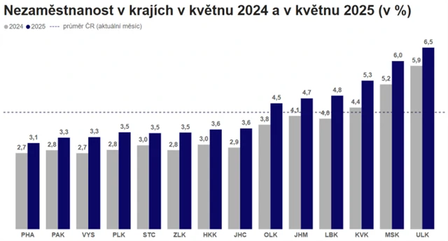 V rámci regionálního srovnání zůstává nejvyšší podíl nezaměstnaných v Ústeckém kraji (6,5 %) a v Moravskoslezském kraji (6,0 %). V porovnání s dubnem se mírně snížil podíl nezaměstnaných celkem v šesti krajích. Kromě Ústeckého kraje byl zaznamenán pokles ještě v Karlovarském, Jihočeském, Jihomoravském a Olomouckém kraji a také v Kraji Vysočina.
