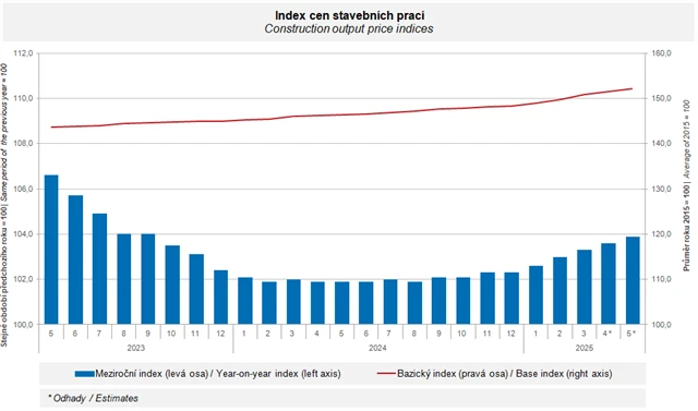 Ceny stavebních prací se meziměsíčně dle odhadů zvýšily o 0,4 %, ceny materiálů a výrobků spotřebovávaných ve stavebnictví vzrostly o 0,1 %. Ceny stavebních prací se meziročně dle odhadů zvýšily o 3,9 % (v dubnu o 3,6 %). Ceny materiálů a výrobků spotřebovávaných ve stavebnictví byly vyšší o 1 % (v dubnu o 0,7 %).