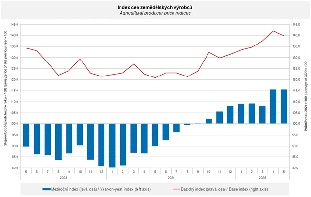 Ceny zemědělských výrobců v tuzemsku v květnu meziměsíčně klesly o 1,5 %, meziročně ale byly vyšší o 15,7 %. Ceny průmyslových výrobců klesly meziměsíčně o 0,6 % a meziročně o 0,8 %. Ceny stavebních prací meziměsíčně vzrostly o 0,4 % a meziročně byly vyšší o 3,9 % a ceny tržních služeb pro podniky se meziměsíčně zvýšily o 0,2 % a meziročně byly vyšší o 4,4 %.