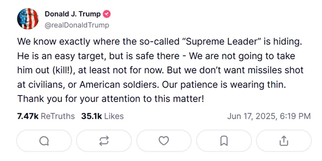 Prezident Donald Trump v příspěvcích na síti Truth Social vyzval íránského vůdce Alího Chameneího k "bezpodmínečné kapitulaci" a naznačil, že Spojené státy vědí, kde se ukrývá. Dodal, že ačkoli je Chameneí snadným cílem, zatím jej nechce zabít. Varoval ale před dalšími útoky na civilisty a americké vojáky.
