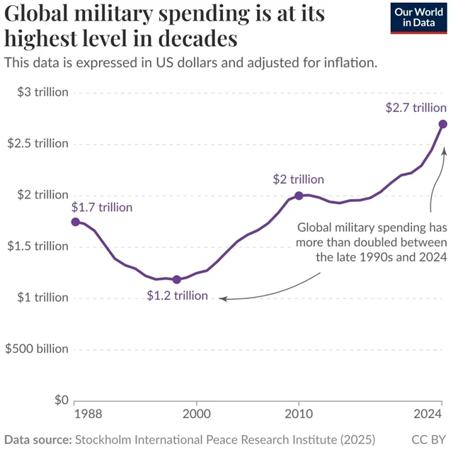 Pokud 90. léta byla ve světě obdobím omezování výdajů na obranu a zbrojení, dnešek je přesným opakem. V závěru 90. let 20. století šlo na zbrojení ročně "jen" asi 1,2 bilionu dolarů, loni to byl už více než dvojnásobek.