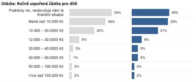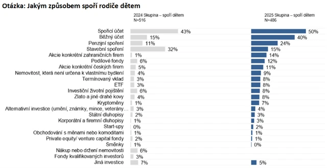 "Meziročně se zmenšila skupina populace, která uvádí, že nemá prakticky žádné prostředky na to, aby svým dětem spořila (34 % v roce 2024 oproti 30 % letos). Naopak lze sledovat velmi výrazný nárůst počtu těch, kdo spoří dětem částku vyšší než 30 000 Kč," uvádí Jana Brodani, výkonná ředitelka AKAT ČR.