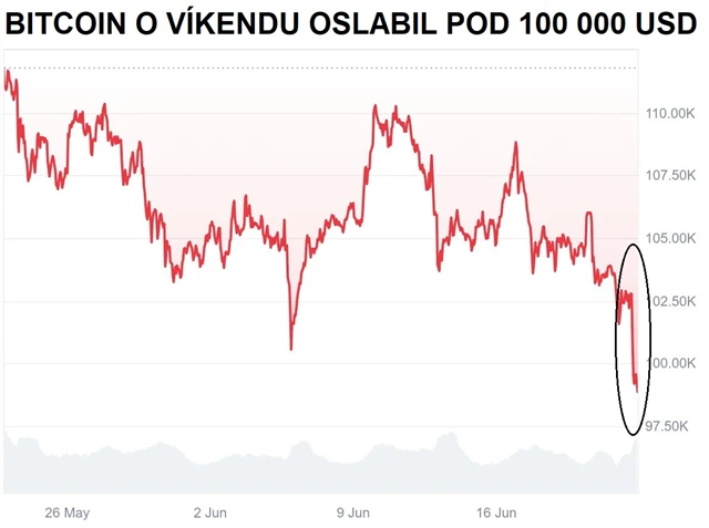 Bitcoin se během neděle obchodoval pod 100 000 USD a zlevňoval o více než 3 % poté, co Spojené státy zaútočily na íránská jaderná zařízení. Výrazně oslabily i další kryptoměny v čele s etherem. Fanoušci krypta to nemají rádi, ale pokud bychom připustili, že se kurz bitcoinu zkrátka v poslední době vyvíjí společně s cenami akcií, lze na začátku týdne očekávat citelnou nervozitu na hlavních burzách.