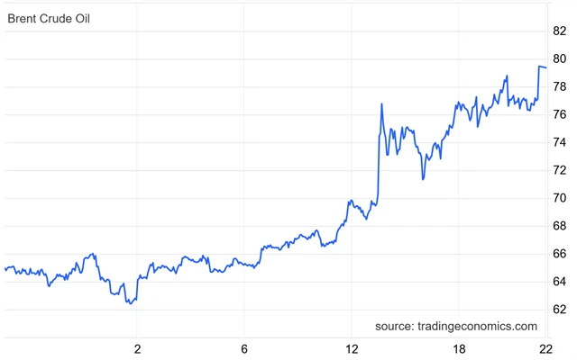 Ceny ropy po víkendové tržní pauze v pondělí nad ránem vystřelily zhruba o 3 % výše. Důvodem je zapojení Spojených států do konfliktu Izraele s Íránem, na které hodlá Teherán mimo jiné reagovat omezením provozu v Hormuzském průplavu, kudy se přepravuje zhruba pětina globální produkce ropy.