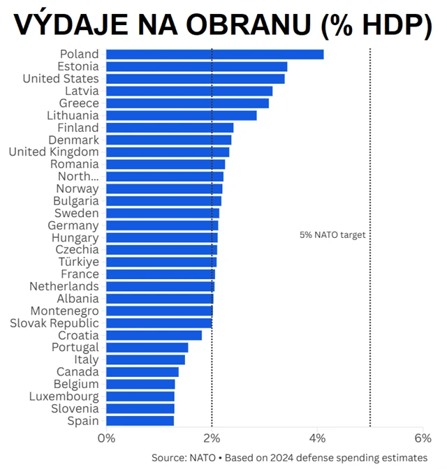 5 % HDP na obranu: Tento graf naznačuje, jak náročný cíl to pro země NATO bude