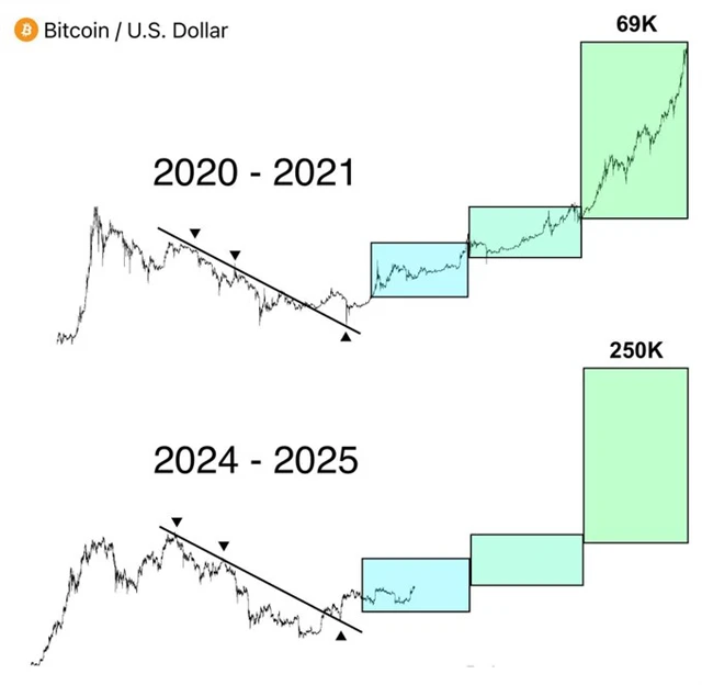 Vývoj ceny bitcoinu z posledních čtvrtletí se nápadně podobá jejímu vývoji z let 2020 a 2021. Pokud bude trend stejný i v druhé polovině roku, mohou se investoři už brzy dočkat cenovky 250 tisíc dolarů.