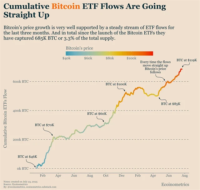 Na cenu bitcoinu má v současnosti největší vliv institucionální poptávka. Vedle jednotlivých firem nakupují bitcoiny zejména spotové ETF. A trh je nyní ve třetí silné růstové fázi za poslední rok a půl.