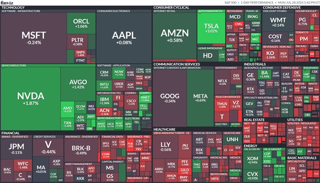 Americké akciové indexy uzavřely pondělní obchodování bez větších změn, a to navzdory nově oznámené obchodní dohodě USA s Evropskou unií. Investoři se soustředili spíše na blížící se klíčové události začínajícího týdne, zejména na rozhodnutí Fedu o úrokových sazbách, důležité zprávy z ekonomiky (HDP, nezaměstnanost) a výsledky velkých technologických firem.