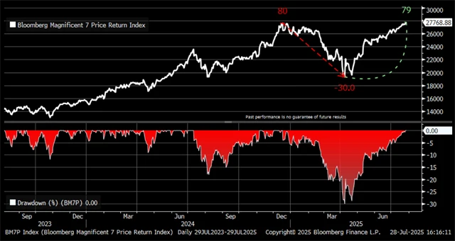 Po 159 obchodních dnech se index akcií takzvané úžasné sedmičky, kam vedle zmíněných patří ještě Alphabet (-0,34 %), NVIDIA (+1,87 %) a Tesla (+3,02 %), vyhoupl na nový rekord. 80 dnů mu to trvalo na dno, 79 zpátky na vrchol.