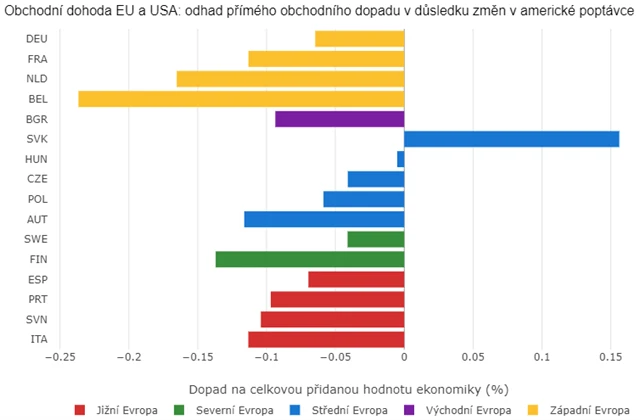 Podle hlavního ekonoma Patria Finance Jana Bureše ekonomické dopady výsledné dohody mezi USA a EU z uplynulého víkendu, jakkoli z pohledu Evropské unie rozhodně dohoda není hodna velkých oslav, budou v součtu lehce pozitivní. "Celková přímá celní zátěž i přímé obchodní dopady do evropské ekonomiky sice lehce vzrostou, ale ne všude. Zejména ve střední Evropě a v Německu s vyšším podílem segmentu automotive budou změny minimální (Slovensko a Maďarsko si podle našich propočtů dokonce lehce polepší). Z hlediska ekonomiky je ale důležitější, že je zažehnáno riziko vysokých sektorových cel, které zvyšovalo nejistotu a tlumilo investiční aktivitu v páteřních evropských sektorech," říká.