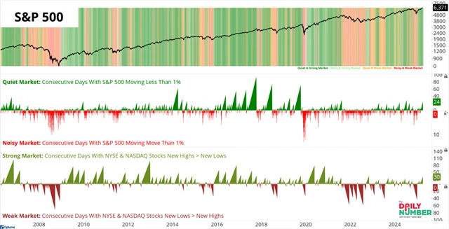 Aktuálně má za sebou trh dokonce již 25 obchodních dnů, kdy se závěrečný kurz indexu S&P 500 nezměnil oproti předchozímu dnu o více než procento. Ve středu se pak na 30 zastavila série dnů, kdy na burzách NYSE a Nasdaq bylo více titulů na nových maximech než minimech (Nasdaq si sérii protáhl, na NYSE ale převážila nová minima). Obě série nicméně do poloviny týdne bylo možné interpretovat celkem jasně: Na americkém trhu není žádný náhodný klid, trh je strukturálně silný.