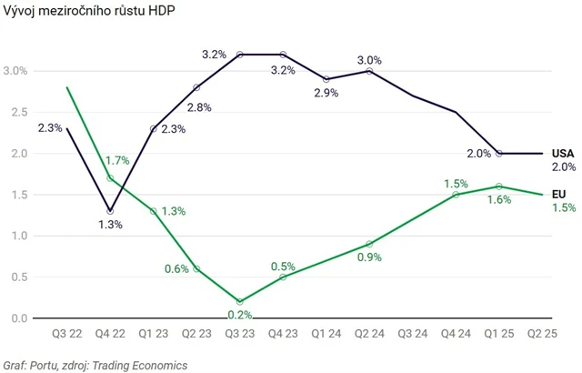 Americká ekonomika v druhém čtvrtletí vzrostla meziročně o 2 % a anualizovaně o 3 %, čímž překonala odhady analytiků. Silný výkon podpořil prudký pokles dovozu zboží po zavedení obchodních cel a silná spotřeba domácností. Ekonomika Evropské unie dosáhla meziročního růstu 1,5 %, což znamená zpomalení z 1,6 % v prvním čtvrtletí. Evropu díky masovému turismu táhly vzhůru Španělsko a Portugalsko, naopak slabý výkon stále vykazují Německo a Itálie.