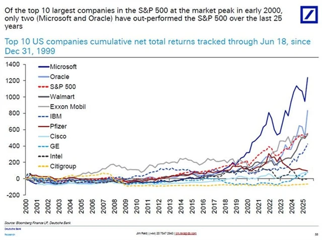 Pouze dvě z deseti největších společností z indexu S&P 500 v době vrcholu na trzích na začátku roku 2000 v dalších 25 letech překonaly výkonnost indexu S&P 500. Jde o Microsoft a Oracle. Zbytek top desítky za trhem zaostal.