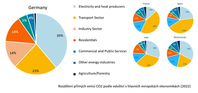 V Německu jsou obytné budovy zodpovědné za 14 % celkových emisí, což je srovnatelné s průmyslovým sektorem. Itálie a Francie následují těsně za Německem, emise z obytných budov tam tvoří 13 %, respektive 12 % celkových emisí. I v zemích jako Nizozemsko (11 %) a Španělsko (7 %), kde je elektřina čistší nebo poptávka po vytápění nižší, představují domácnosti stále významnou část emisí.