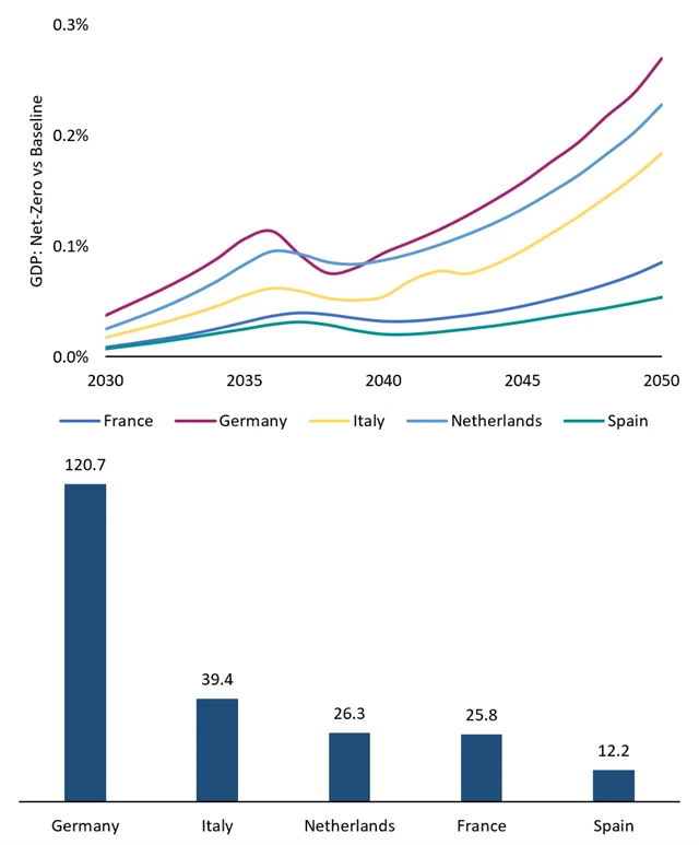 Zatímco v prvních letech (2030–2040) dojde pouze k mírnému nárůstu hrubé přidané hodnoty v odvětví nemovitostí, který bude o 5 % vyšší než v pravděpodobném scénáři, od roku 2040 se situace výrazně změní, protože poklesnou provozní náklady, vzroste poptávka a zlepší se energetická účinnost. Mezi lety 2041 a 2050 by hrubá přidaná hodnota v odvětví nemovitostí měla překročit základní scénář o 20–30 %, zejména ve Španělsku a Nizozemsku. Celkově by toto odvětví mohlo do roku 2050 vytvořit téměř 1 bilion eur dodatečné hodnoty pouze v Německu.