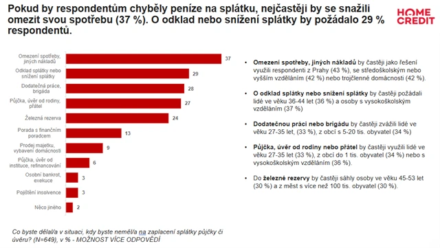 Pokud by se respondenti ocitli v situaci, kdy nemají na splátku, 37 % dotazovaných by se snažilo omezit spotřebu. Další častou možností, kterou uvádí 29 % lidí, je žádost o odklad nebo snížení splátky. Zajímavé je, že přes 40 % obyvatel Prahy, středoškoláci a vysokoškoláci častěji volí omezení spotřeby, lidé ve věku 36–44 let preferují odklad splátek.