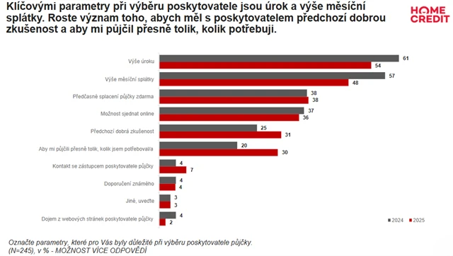 Jak uvádí více než 57 % respondentů, klíčovými faktory při výběru poskytovatele půjčky zůstávají úrok a výše měsíční splátky. Oproti loňskému roku vzrostl u dotazovaných také význam předchozí dobré zkušenosti s poskytovatelem a možnost půjčit si přesně tolik, kolik je potřeba. Tento trend naznačuje, že Češi se stávají obezřetnějšími a informovanějšími spotřebiteli.