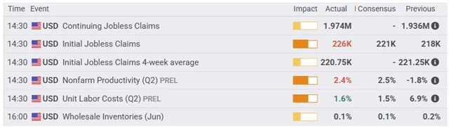 K poklesu indexu Dow výrazně přispěly akcie Caterpillaru (-2,48 %) po varování firmy, že cla mohou negativně ovlivnit její podnikání. Napomohla ani slabost v některých segmentech technologického sektoru (Salesforce -3,32 %). Důvodem mohla být prognóza společnosti Fortinet, která naznačila, že plánovaná obměna softwarových produktů bude méně rozsáhlá, než se předpokládá. Výrazně ztrácely akcie společnosti Eli Lilly (-14,14 %) po zklamání z výsledků pokročilé fáze testů léku na obezitu, a to i přes oznamení lepších než očekávaných výsledků za druhé čtvrtletí a zvýšení celoroční prognózy.