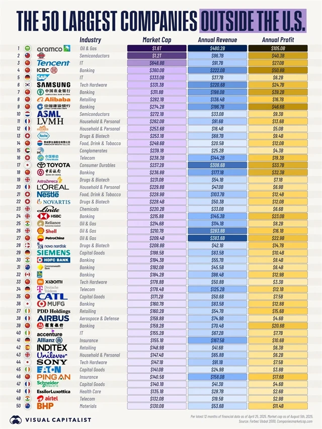 Od ropných gigantů po titány v oblasti výroby čipů, korporátní svět mimo Spojené státy je velký a rozmanitý. Následující žebříček zahrnuje 50 největších veřejně obchodovaných firem se sídlem mimo Spojené státy. Údaje o ročních tržbách a ziscích firem jsou převzaty ze žebříčku Forbes Global 2000, který vychází z ukazatelů za 12 měsíců do letošního dubna.