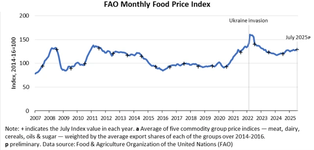 V červenci dosáhly světové ceny potravin podle Organizace OSN pro výživu a zemědělství (FAO) více než dvouletého maxima. Souhrnný index FAO, sledující ceny obilovin, olejů, mléčných výrobků, masa a cukru, vzrostl oproti červnu o 1,6 % na 130,1 bodu, což je nejvyšší hodnota od února 2023.
