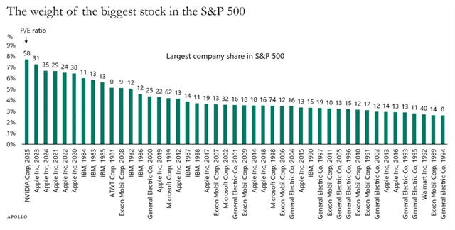 Společnost NVIDIA je v současnosti největší v celém akciovém indexu S&P 500, pokud jde o tržní kapitalizaci. To jen dokládá extrémní koncentraci trhu v největších titulech, jež je do značné míry poháněna vírou ve světlé zítřky spojené s umělou inteligencí. NVIDIA svým 8% podílem překonává všechny největší tituly v rámci indexu od začátku 80. let, kdy se tato data začala sledovat.