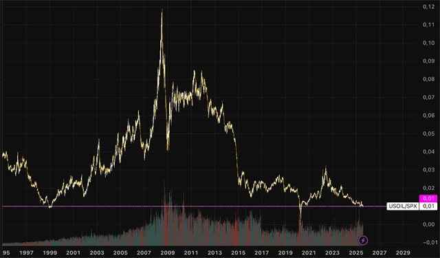 Stagnace nebo mírný pokles ceny ropy WTI v době, kdy akciový index S&P 500, má jasný výsledek. Poměr cen těchto dvou sledovaných tržních "veličin" spadl na úrovně, na kterých byl jen těsně před vrcholem technologické bubliny a pak v roce 2020, kdy se na trzích v souvislosti s pandemií děly hodně nestandardní věci. Jestli i tentokrát zlevnění ropy vůči akciím něco znamená, teprve uvidíme.