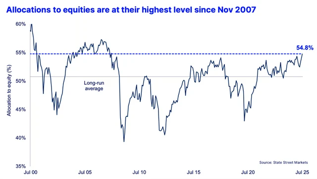 Alokace institucionálních investorů v amerických akciích je nejvyšší za bezmála osmnáct let. To naznačuje, že i konzervativnější správci velkých portfolií (mimo jiné penzijní fondy, pojišťovny, podílové a hedgeové fondy, nadace nebo trusty) "sázejí" na pokračování růstového trendu na akciovém trhu.