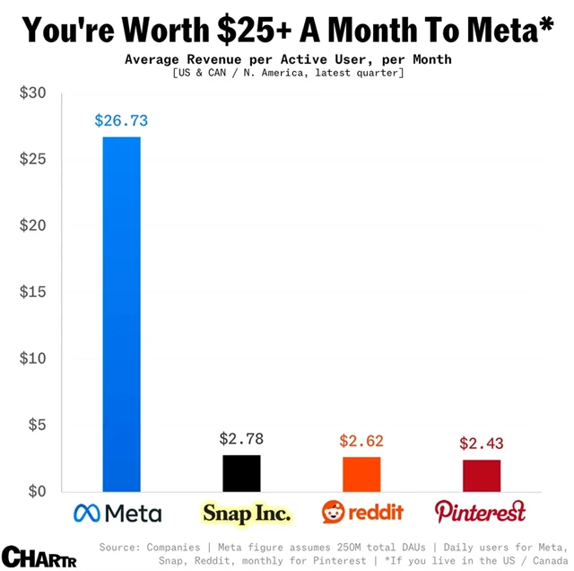 Sociální sítě na internetu nejsou pro dobro lidí. To, že je to pouze a jen byznys, je asi všem jasné. Ale kolik provozovatelé sociálních sítí na tom, že jejich produkty používáte, vlastně vydělávají? V případě Snapu, Redditu nebo Pinterestu je to na uživatele něco mezi 2,40 a 2,80 dolaru za měsíc. Ale pak je tu Meta s Facebookem a Instagramem a čtvrt miliardou denně aktivních uživatelů. A to je docela jiná liga.