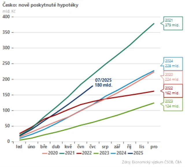 Český hypoteční trh je rozpálený doběla. Podle České bankovní asociace byly v červenci poskytnuty nové hypotéky v objemu 30 miliard Kč. To je nejvyšší hodnota od konce roku 2021, kdy vrcholil pandemický hypoteční boom. Pokud tato silná dynamiky vydrží, bude trh za celý rok atakovat objem 300 miliard Kč. Průvodním jevem růstu je také vyšší průměrná velikost nově poskytnuté hypotéky. Ta v současnosti dosahuje 4,3 milionu Kč, před dvěma lety to bylo jen 3,1 milionu Kč.