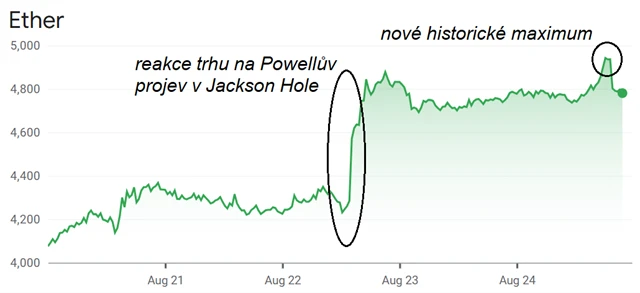 Cena druhé největší krypotměny na světě ether v pátek překonala dosavadní historické maximum z roku 2021 a stoupla těsně pod 4 900 USD. V neděli pak na přechodnou dobu ether zdražil dokonce lehce nad 4 950 USD. Obchodníky k novým nákupům kryptoměn koncem týdne přiměl Powellův projev.