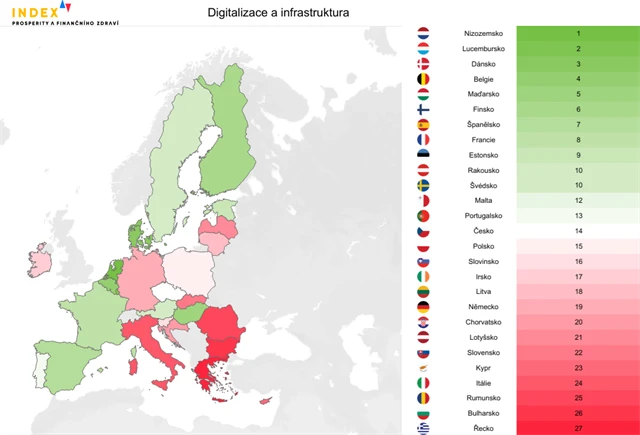 Na pozicích eurounijních premiantů v digitalizaci a infrastruktuře najdeme podobně jako loni Nizozemsko, Lucembursko a Dánsko, které spojuje především dobrá dostupnost rychlého internetu a husté pokrytí dobíjecími stanicemi pro elektromobily. Velký kus cesty ke kvalitnější infrastruktuře i vyššímu stupni digitalizace naopak ještě musejí ujít Rumunsko, Bulharsko a vůbec poslední Řecko, které má z celé EU nejhorší nejen dostupnost internetu v domácnostech obecně, ale také pokrytí vysokorychlostním internetem. Průměrný Řek také vydá zdaleka nejvíce peněz oproti ostatním obyvatelům EU na veřejnou dopravu.