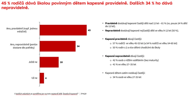 Věk, kdy děti začínají dostávat kapesné, je klíčový pro jejich finanční vzdělávání. Podle průzkumu společnosti Home Credit se tak nejčastěji děje mezi 8. a 10. rokem života, kdy 35 % dětí poprvé poznává hodnotu peněz. Tento moment je důležitý pro rozvoj finanční odpovědnosti a samostatnosti. Kapesné je pro děti nejen příležitostí, jak si pořídit drobné radosti, ale také důležitým nástrojem pro rozvoj finanční gramotnosti. Pravidelně ho dostává 45 % školou povinných dětí, 34 % rodičů poskytuje kapesné nepravidelně. Zajímavé je, že děti nad 12 let dostávají kapesné pravidelně v 61 % případů. Tento finanční rituál je častější v rodinách s více dětmi a u rodičů ve věku 45 až 53 let.
