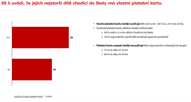Vlastní platební karta je pro mnoho dětí symbolem důvěry a samostatnosti. Podle průzkumu ji má 59 % nejstarších školou povinných dětí. Děti nad 12 let ji využívají v 86 % případů, což reflektuje rostoucí trend digitalizace a potřebu dětí být finančně nezávislé. Rodiny s více dětmi a pravidelným kapesným jsou v tomto ohledu na špičce.