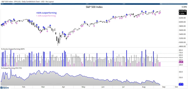 A zatímco jarní hluboká korekce probíhala zhusta tak, že na denní bázi velká část akcií z indexu S&P 500 sice výkonnostně samotný benchmark překonala, ale níže jej stáhly některé velké tituly, zejména technologické, současný vzestupný trend častěji probíhá v opačném gardu – výkon lepší než index často podává ani ne třetina akcií, ale stačí to na celkový posun indexu výše. Středa 10. září byla například druhým dnem v řadě, kdy méně než třetina akcií překonala svým výkonem samotný index (postarala se o to značnou měrou NVIDIA). Od začátku roku pak pouze 37 % akcií z indexu překonává jeho výkonnost (+11,09 %).