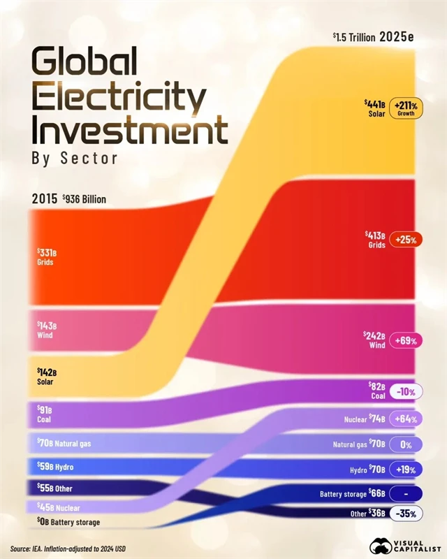 Boom generativní umělé inteligence zvyšuje poptávku po elektřině, protože datová centra spotřebovávají obrovské množství energie na trénování a provoz velkých jazykových modelů. Velké technologické firmy jsou hlavním hybatelem těchto investic a uzavírají miliardová partnerství v oblasti zelených zdrojů, jako jsou jaderná a solární energie. Podobně Čína se loni podílela téměř dvěma třetinami na celosvětovém přírůstku kapacity obnovitelných zdrojů. Graf ukazuje, jak se za poslední desetiletí změnily globální investice do elektřiny.
