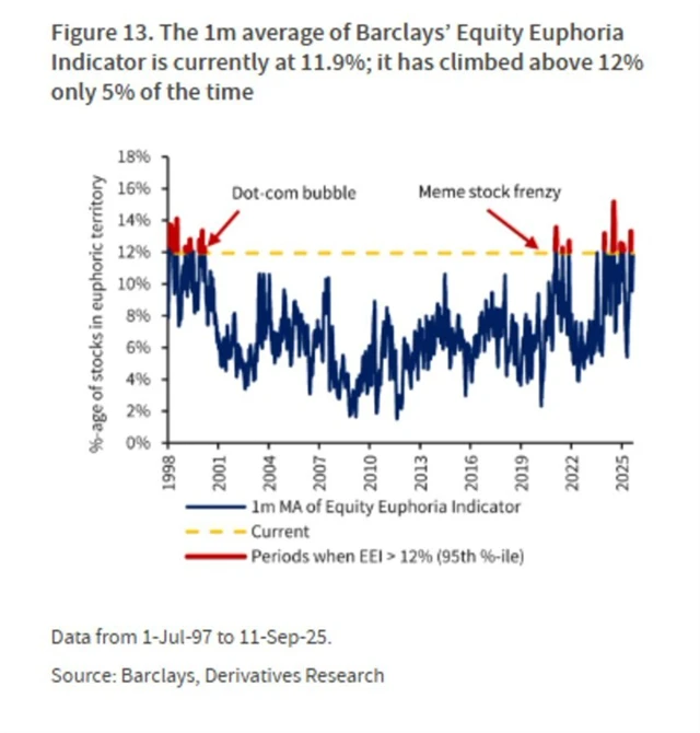 Nejprve dva grafy. První je z dílny Barclays a dává čtenářům na srozuměnou, že je americký akciový trh na hraně euforie. Tedy jasné varování, že růst cen akcií bez nějaké korekce už zkrátka nemůže dlouho pokračovat.
