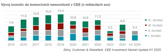 Trh komerčních nemovitostí ve střední a východní Evropě (CEE) pokračuje v dynamickém růstu. Podle nejnovější zprávy realitněporadenské společnosti Cushman & Wakefield dosáhl celkový objem investic v první polovině roku 2025 celkem 5,36 miliardy eur, meziročně o 51 % více. Západní Evropa zaznamenala ve stejném období nárůst pouze o 5 %, přičemž souhrnný objem investic zde dosáhl přibližně 100 miliard eur. Rozdíl v tempu růstu ilustruje posun investiční dynamiky směrem do CEE a podtrhuje rostoucí význam regionu v evropském kontextu. Významné je také rozložení investic mezi jednotlivé sektory – zatímco v CEE dominují především investice do průmyslových a logistických nemovitostí (v některých zemích, jako je Slovensko, tvoří průmysl až 58 % objemu), západní Evropa se stále více zaměřuje na rezidenční a maloobchodní segmenty, logistika ale zůstává i tam podstatnou součástí trhu.