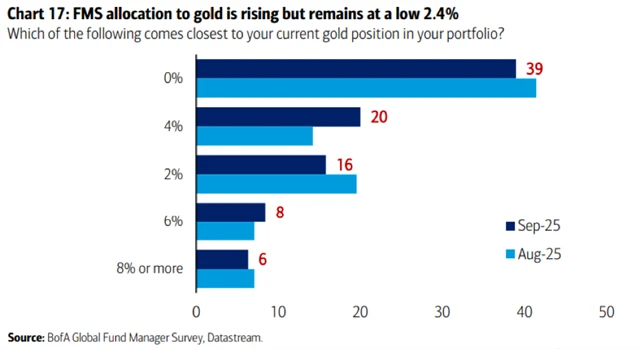 Graf ukazuje, že alokace do zlata u fondů, jejichž manažeři se zúčastnili průzkumu Bank of America, v září mírně vzrostla. Podíl fondů, které zlato úplně ignorují, oproti srpnu mírně klesl na 39 %. Naopak například vzrostl podíl fondů, které mají ve zlatě 4 % hodnoty spravovaných aktiv. Celkově se ale podíly za poslední měsíc příliš nezměnily.