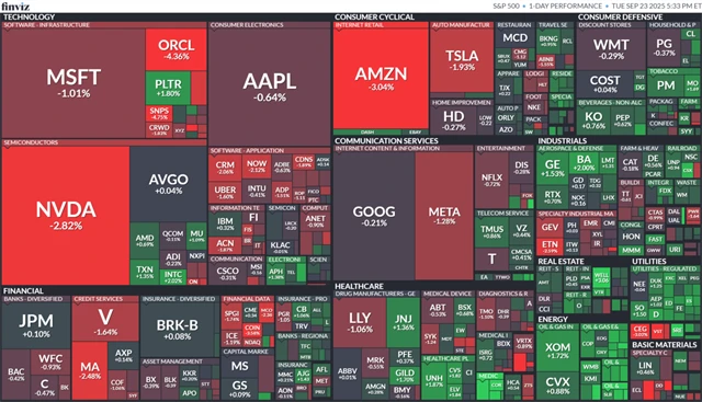 Index Dow se snížil o 0,19 % na 46 292,78 bodu, širší index S&P 500 po dosažení nového intradenního rekordu nakonec klesl o 0,55 % na 6 656,92 bodu a technologický Nasdaq Composite odepsal 0,95 % na 22 573,47 bodu. Index volatility VIX stoupl o 3,35 % na 16,64 bodu a výnos 10letých vládních dluhopisů USA klesl o zhruba čtyři bazické body na 4,110 %. Ceny ropy se zvedly zhruba o dvě procenta poté, co Donald Trump na plenárním zasedání Valného shromáždění OSN (mimo jiné) zkritizoval evropské nákupy energetických surovin z Ruska. Zlato zdražilo na další rekord (+0,5 %) a bitcoin zlevnil asi o 0,7 % na 112 120 USD.