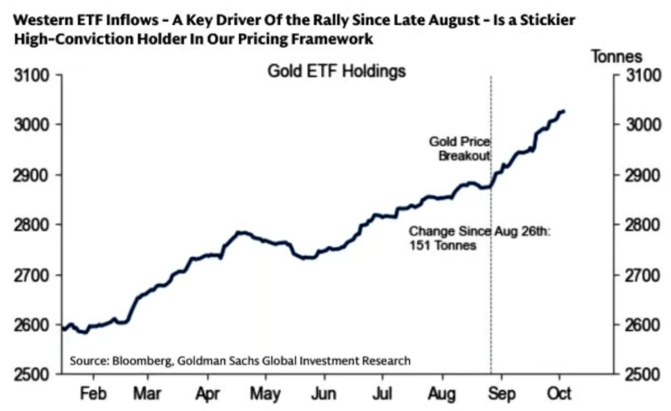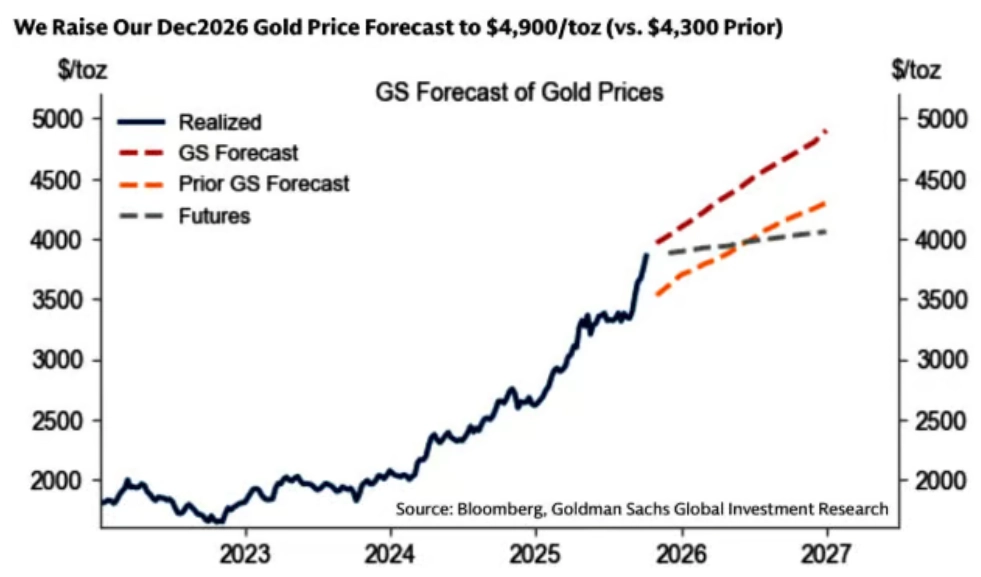 "Zvyšujeme odhad ceny zlata pro prosinec 2026 na 4 900 USD za trojskou unci. Příliv kapitálu do ETF a pravděpodobně i pokračující nákupy zlata do bilancí centrálních bank podporují růst ceny," napsali analytici z Goldman Sachs.