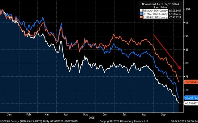 Nejprve graf, který jasně ukazuje, že vzestup ceny zlata neprobíhá jen v amerických dolarech. Hodně se mluví o tom, že je dolar pod tlakem a že jeho role v globálním finančním systému slábne. Nejde ale jen o znehodnocování americké měny, vůči zlatu letos výrazně ztrácejí také euro a japonský jen. V době, kdy na historickém maximu je také "digitální zlato", tedy bitcoin, tak se vkrádá otázka, jestli zkrátka v současnosti nemají nějaký "problém" takzvané fiat měny jako takové.