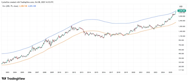 Když ale zůstaneme u nejčastější a mediálně aktuálně atraktivní dolarové ceny zlata, tak ta svým prudkým letošním růstem dospěla až na úroveň, kdy je 75 % nad svým 200týdenním průměrem. Není tedy řeč o žádných krátkodobých výkyvech. "Od této hranice 75 % nad 200týdenním průměrem se cena odrazila v roce 2006 (střednědobý vrchol) a také v letech 2008 a 2011 (vrcholy sedmiletého cyklu, který lze na trhu se zlatem vypozorovat dlouho do minulosti)," napsal na síti X uživatel, který si říká CyclesFan.